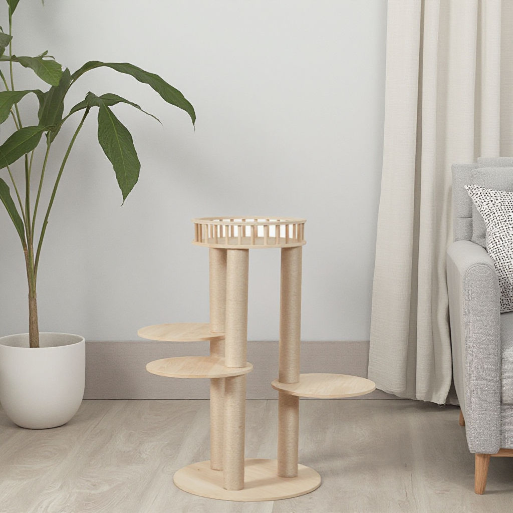 Crafted from eco-friendly wood and sisal, it is durable, safe, and environmentally conscious. Its natural color and compact design (50 x 50 x 115 cm) make it suitable for any indoor space, while customizable designs and OEM options allow for personalized touches.